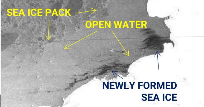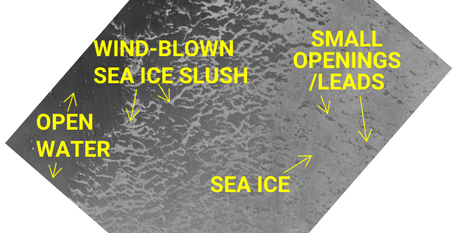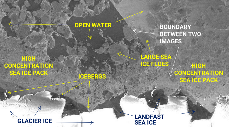 Near-real time SAR imagery is often made available during cruises for ice navigation purposes. It can be useful to be able to do a basic interpratation of a SAR image to assess the sea ice conditions in an area.
