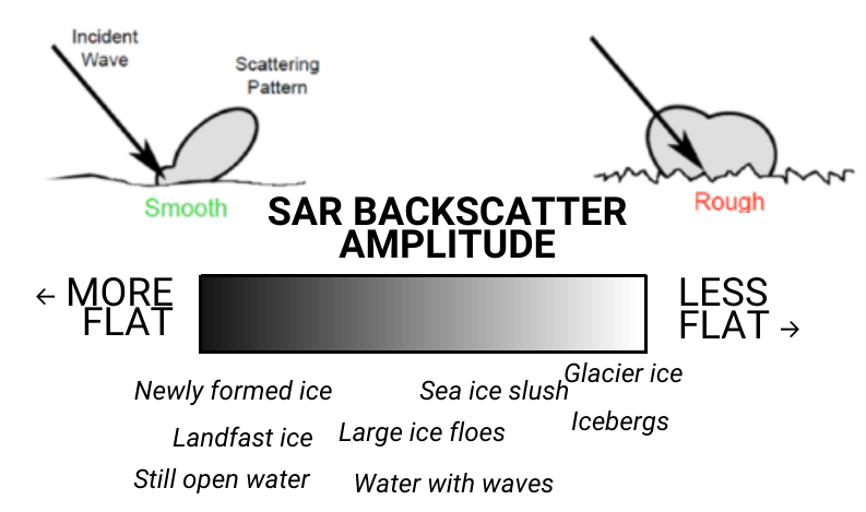 For sea ice and oceanography, SAR measures the surface roughness and texture of the ocean or ice. Smooth water reflects most of the radar signal away from the sensor, therefore very little signal is scattered back to the sensor (low amplitude / dark), while rougher surfaces, such as ice floes or wind-affected water, scatter more signal back toward the satellite (high amplitude / light).