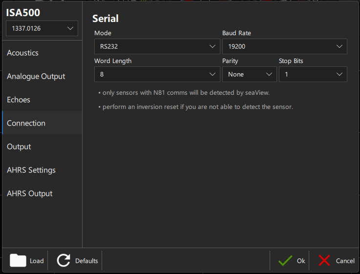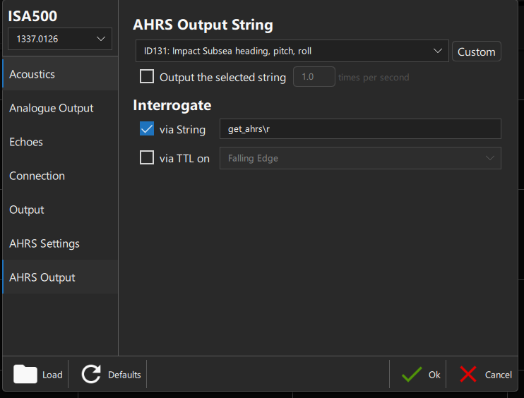 According to BAS recommendation format = ID131. In case the string is supposed to be logged with a specific frequency like the altimeter output above then the first option needs to be checked with the desired frequency. Otherwise, leave this option unchecked to save power. In the example below the ISA500 only sends an AHRS sample via serial once it gets triggered by e.g. get_ahrs followed by a carriage return (\r).