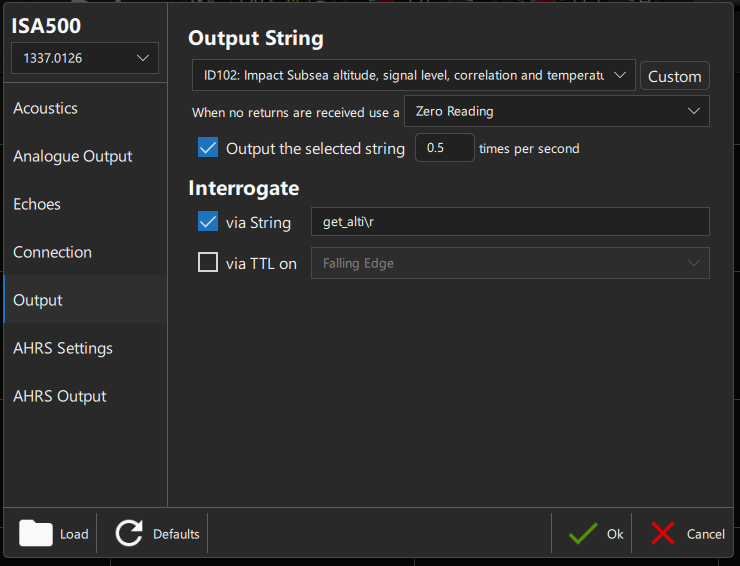 Based on what BAS used, format = ID102 is recommended. If the UM shall log the output for a defined time then the first option needs to be selected with the desired output frequency, e.g. 0.5 Hz. The interrogation string can always be defined and enabled, e.g. get_alti\r - meaning that sending the string get_alti followed by a carriage return (\r) to the ISA500 via the serial connection will trigger the ISA500 returning with one sample string.