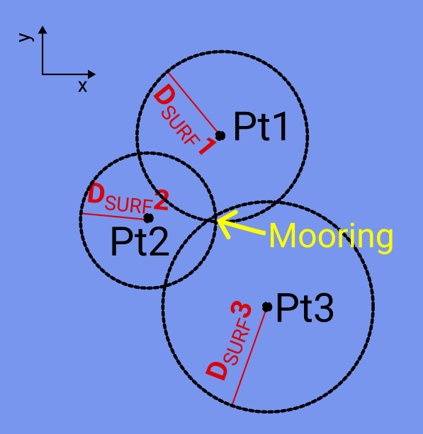 By measuring the distance from the ship on multiple locations to the acoustic release on bottom, we can use pythagoras to determine distances along the surface to the mooring position. If we measure close to a mooring that is located in deep ocean, small errors in measured distances can give large errors in the distance calculated along the surface.