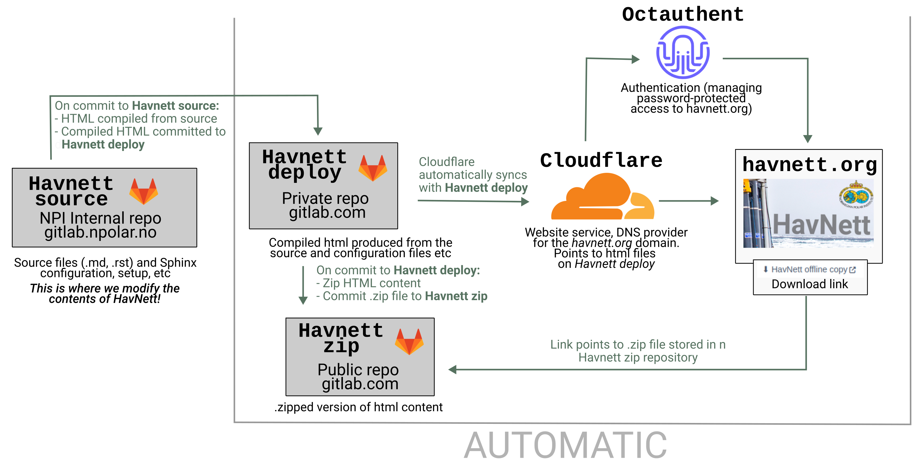 HavNett is set up such that changes to the source code in an internal NPI gitlab repository are automatically propagated to the website https://havnett.org/. The setup, detailed below, has so far proved to be fairly robust.
